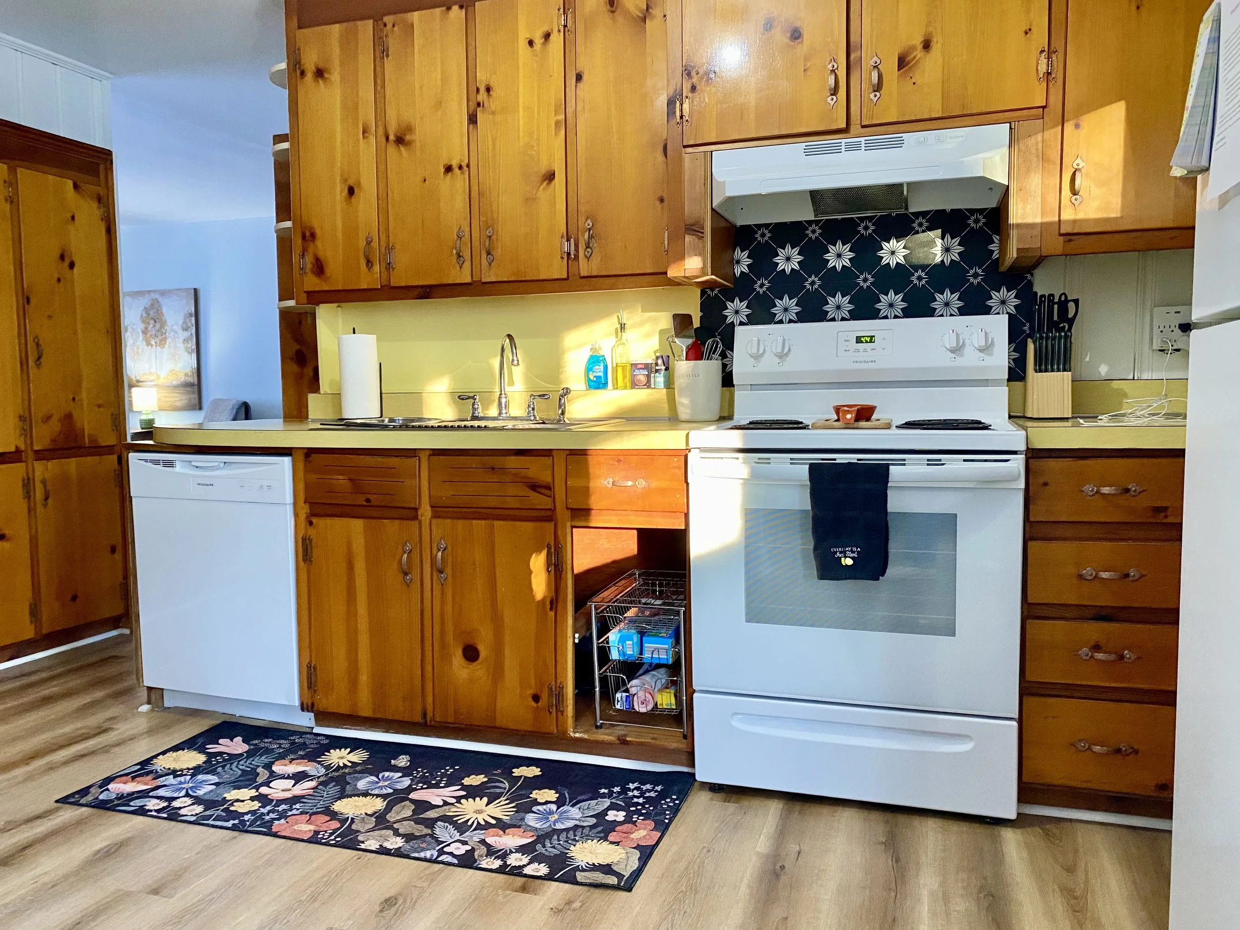 After a third-party completed a move-out clean, the walls were painted in an easy to maintain and bright shade of white. We used some peel-and-stick products to improve the look of the kitchen backsplash, and replaced the drawer knobs in the bathrooms. We created a nice outdoor sitting area under the carport to relax after a long day or to enjoy that first coffee in the morning.