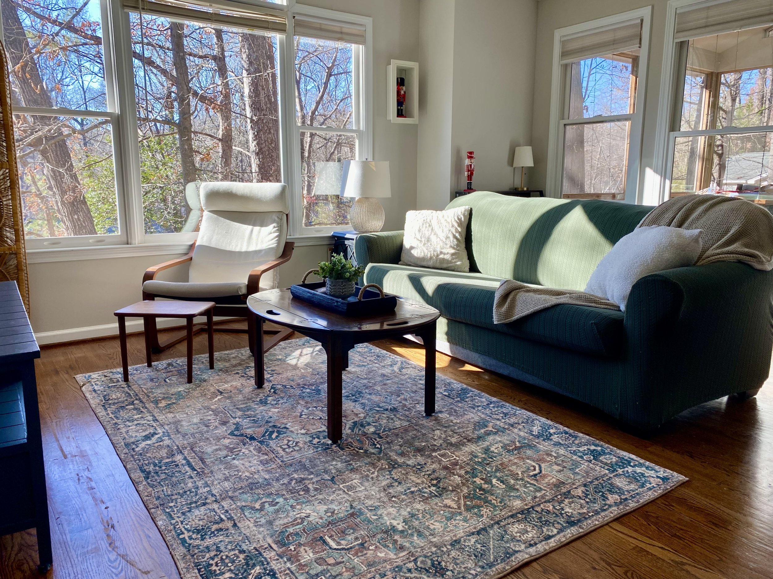 Each year this mid-term rental has been in operation, we’ve re-designed the living room from winter to spring by swapping out textiles and some decor items.